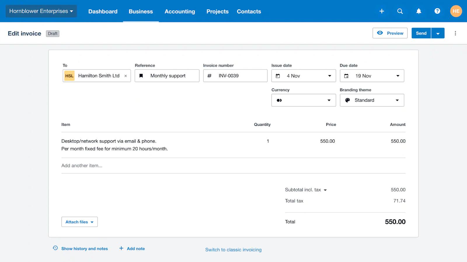 Xero offers a cleaner interface than QuickBooks while still providing solid accounting features. It works well for contractors who want invoicing alongside bank reconciliation and cash flow visibility without getting overwhelmed. Better suited for office use than job-site invoicing.