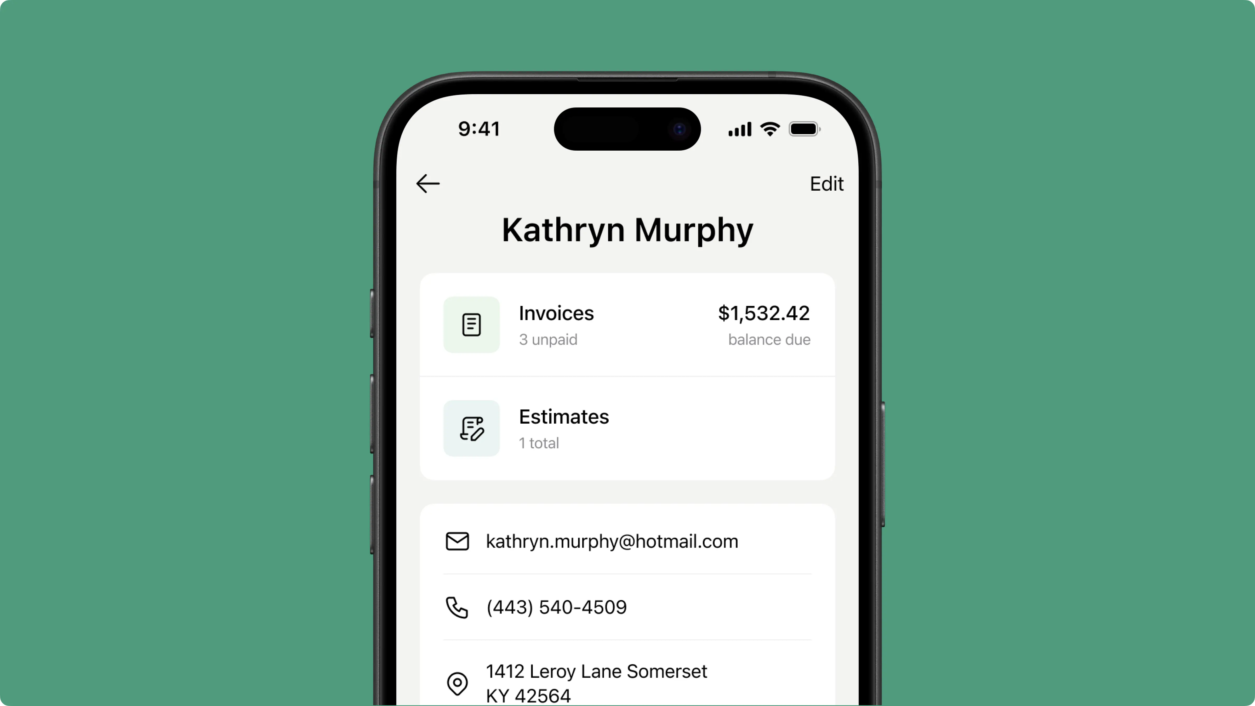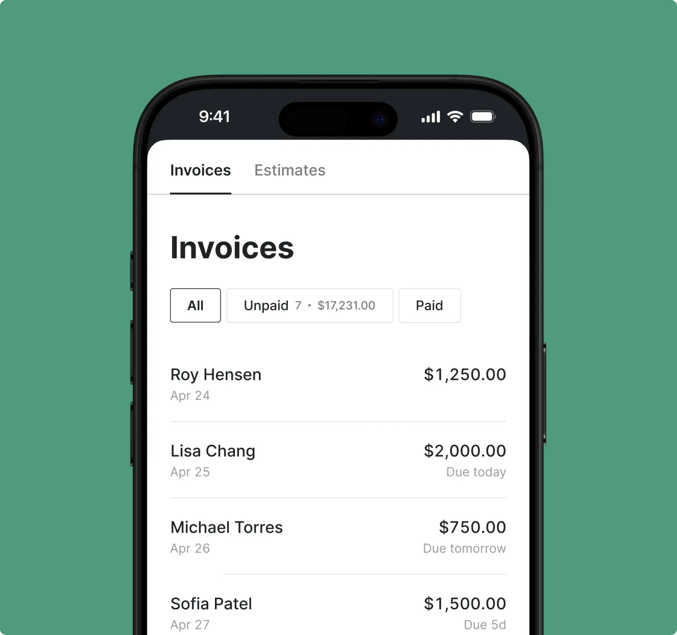 Once a client says yes, turn the estimate into an invoice with one tap. The job stays linked, so you can track payment statuses.