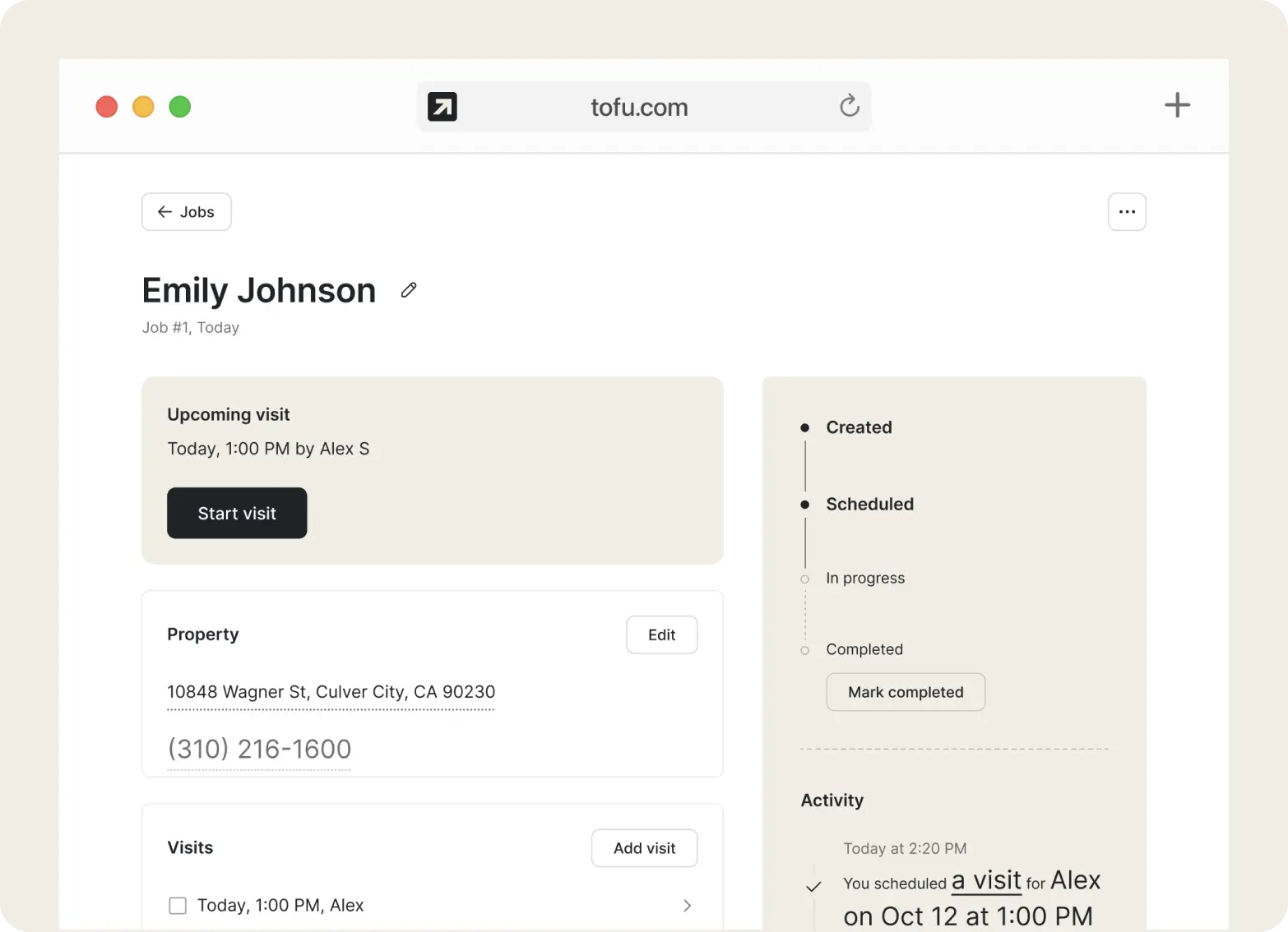 Tofu is a field service job management app for contractors who run jobs on the go – HVAC technicians, plumbers, electricians, painters, roofers, landscapers, and more. Create a job, schedule the visit, log services and materials, attach photos, and send the invoice – all from one job page, on your phone or computer.