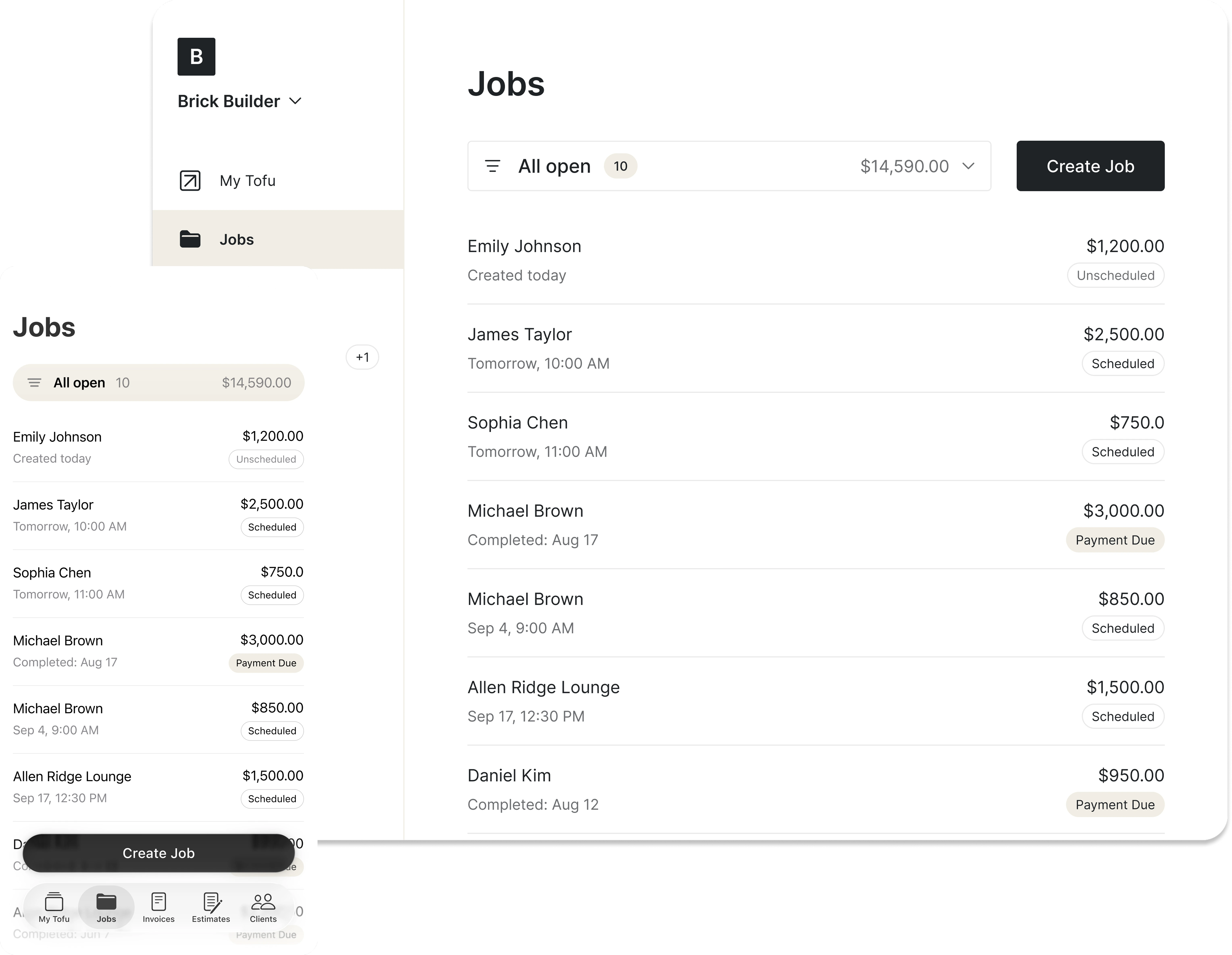 Tofu is designed for owner-operators and crews up to 10 people. You get contractor job management, scheduling, invoicing, estimating, and payments in one place. Available on iOS, Android, tablet, and desktop. Works offline in the field and syncs when you're back in range.